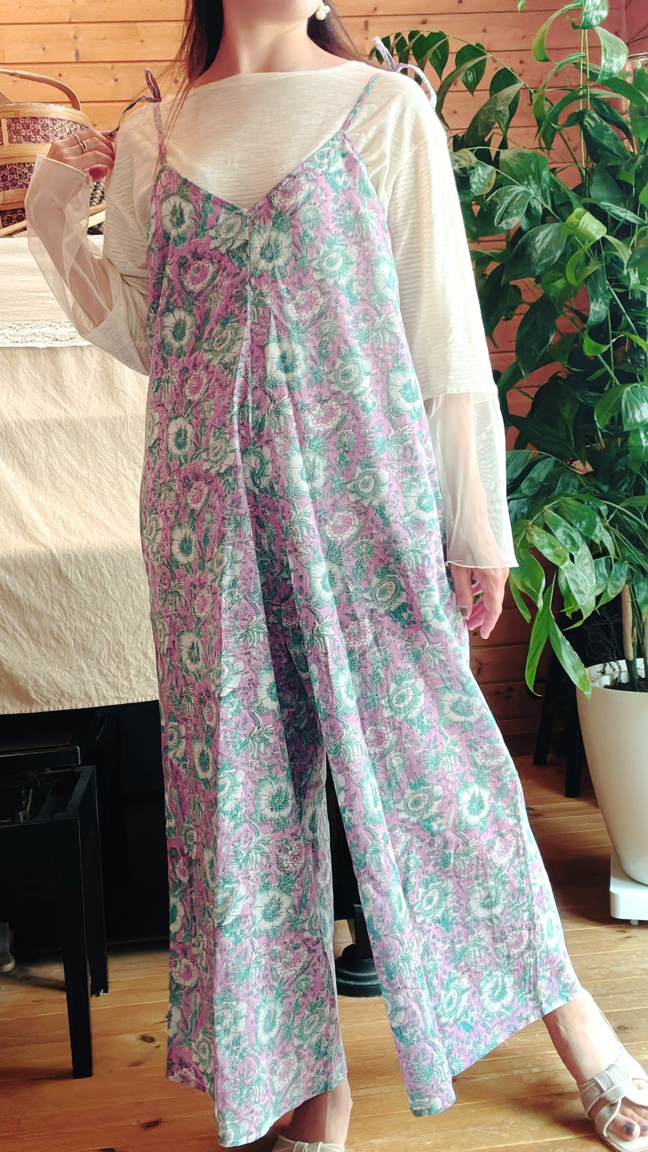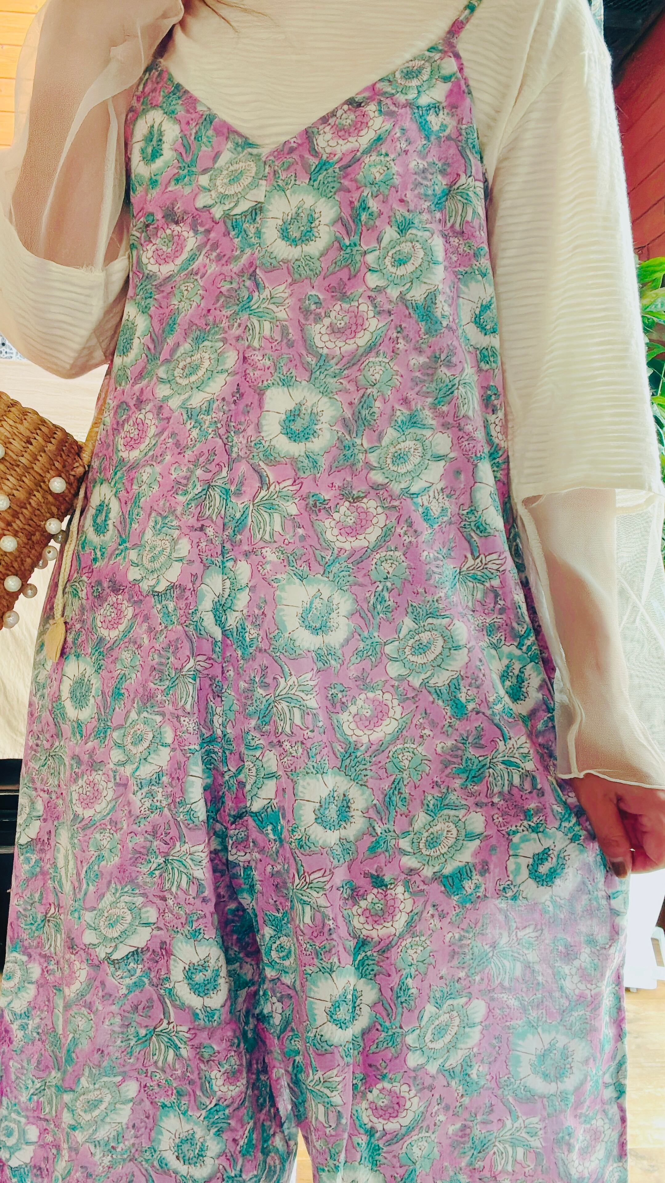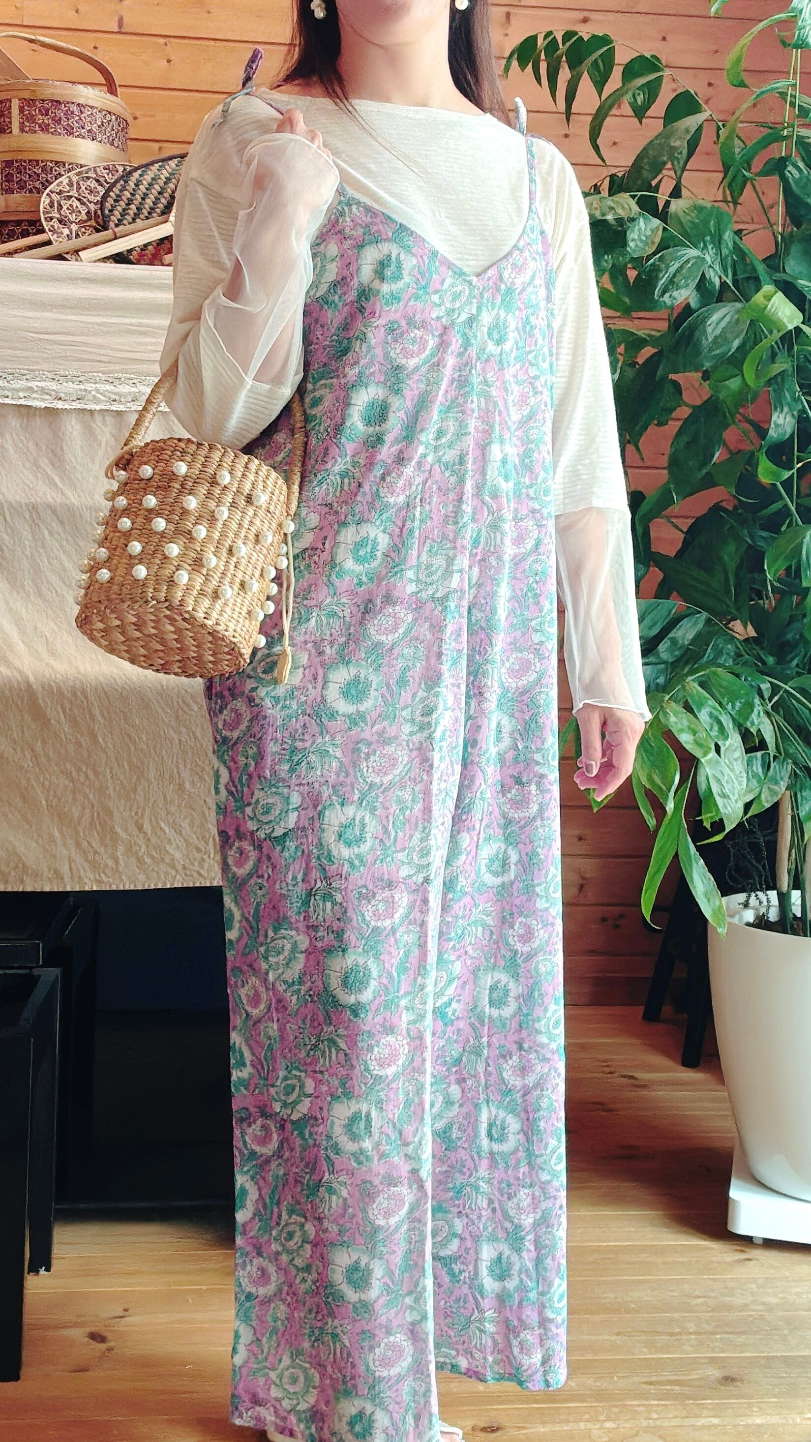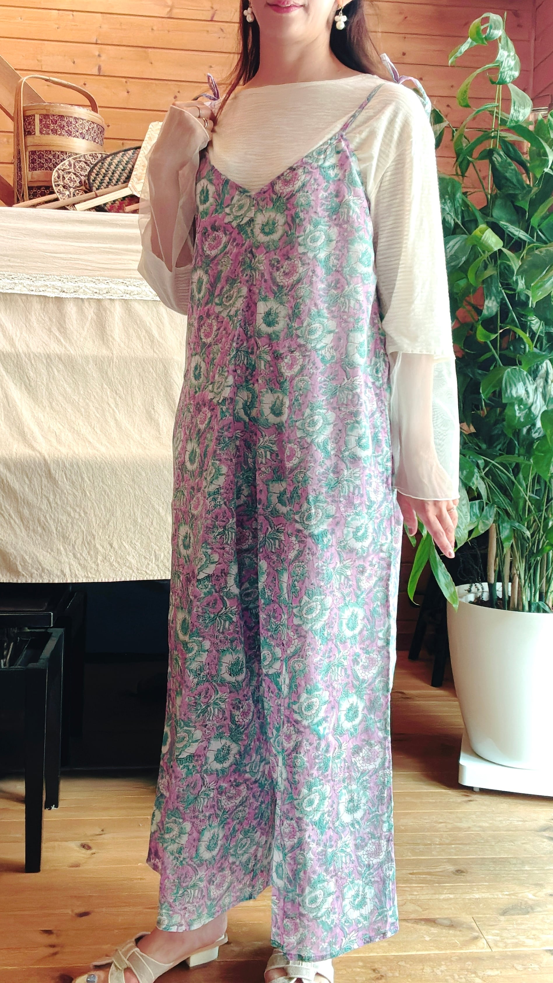 インド綿ブロックプリント/リボンサロペット✳︎Asterパープルライトグリーン